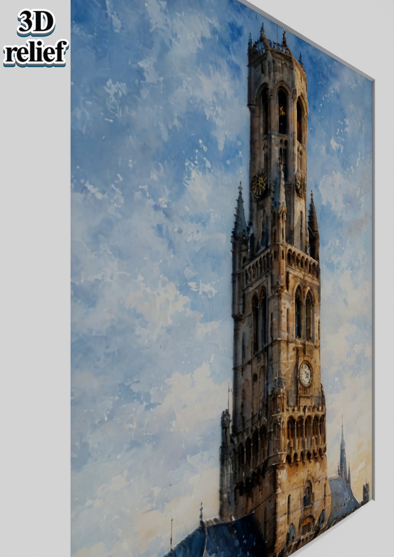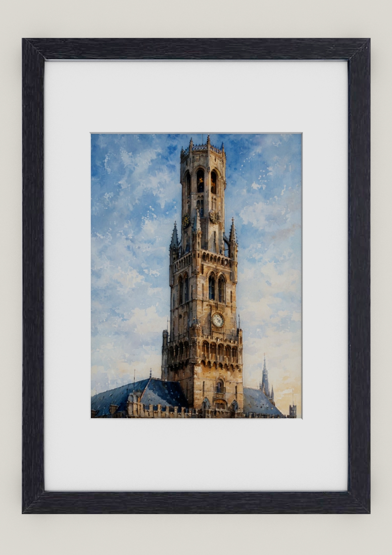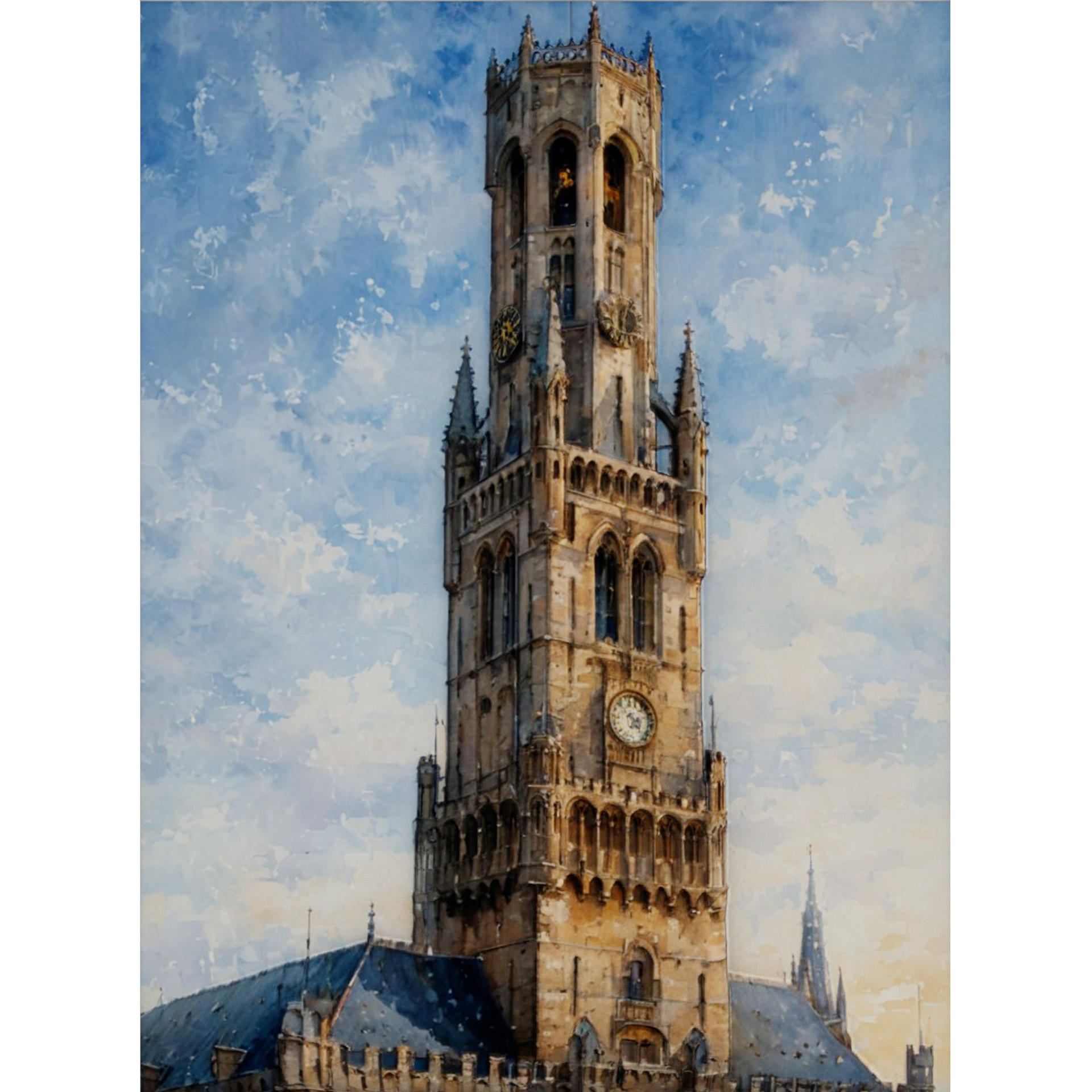 The Belfry of Bruges towers above cobbled streets, its stone silhouette etched against the Flemish sky. Built in medieval might, it once guarded charters and treasures, ringing out the rhythm of city life. Its 366 steps spiral through history, each echo a whisper of merchants, fires, and time’s passing weight. The carillon sings from above, a chorus of bells dancing through the air. Flags flap in the breeze as shadows stretch across Markt Square below. From its summit, red roofs and canals sprawl like a storybook unfolding. The tower leans slightly, as if listening to the centuries it has watched. Brick by brick, it holds Bruges’ soul aloft. The Belfry doesn’t just stand—it remembers. Image by Sergey Ashmarin, cc by-sa 3.0.