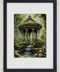 In the heart of the garden stands a weathered gazebo, wrapped in blooming vines.