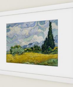 Wheat Field with Cypresses by Vincent van Gogh, painted in 1889, captures the vibrant energy of the Provençal landscape near the asylum at Saint-Rémy. The golden wheat field sways under a vivid blue sky, filled with dynamic, swirling clouds that pulse with movement. Towering cypress trees rise boldly in the scene, their dark green forms contrasting with the light-filled background. Van Gogh’s expressive brushstrokes give life to every element, from the rippling grasses to the rolling hills. The painting reflects both the beauty of nature and the intensity of the artist’s inner world. The cypresses, often symbols of eternity, add a sense of spiritual depth. His color choices—rich blues, yellows, and greens—convey warmth and emotion. Though painted during a time of personal struggle, the work radiates serenity and vitality. Wheat Field with Cypresses stands as a testament to Van Gogh’s ability to find hope and harmony in the natural world.